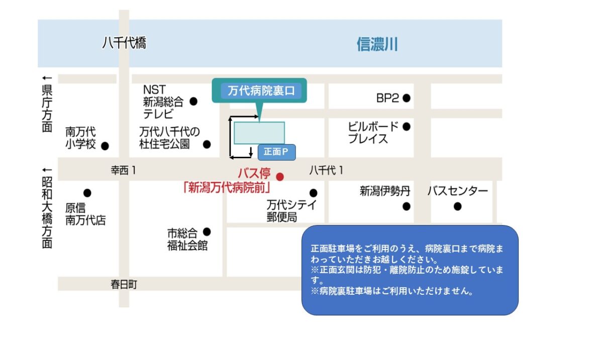 | 駐車場 | 正面駐車場 病院正面玄関 自動扉よりお入りください エレベータで4Fに上がってください | 正面駐車場 病院をまわっていただき病院裏口までお越しください ※正面玄関は防犯・離院防止のため施錠しています。 ※病院裏駐車場はご利用いただけません。 |